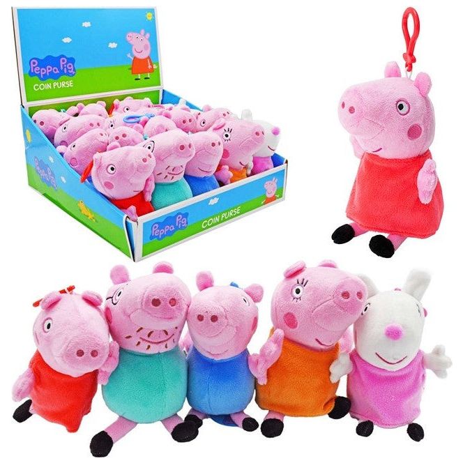 Eine flauschige Plüsch-Figur aus der Familie von Peppa Pig/Peppa Wutz – 14 cm hoch – Material: Polyesterplüsch mit stabilem Kunststoff-Karabiner zum Anhängen an Taschen, Schulranzen oder Kinderwagen. Mit dem kleinen Reißverschluss auf der Rückseitekann ein Münzfach geöffnet werden … perfektfür kleine Schätze!