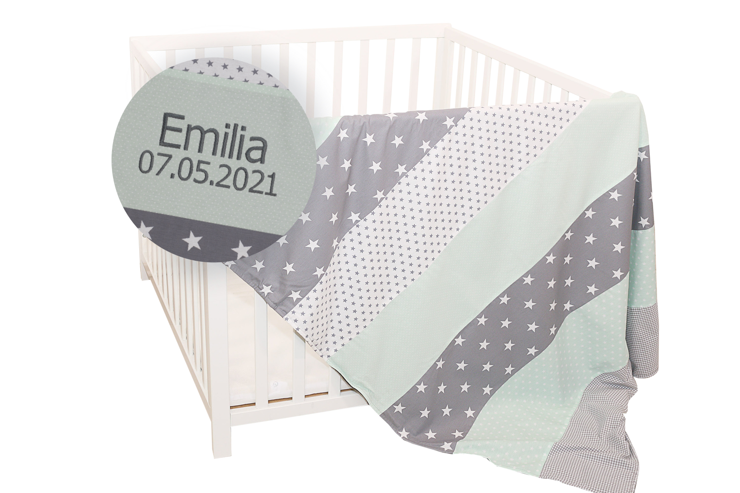 ULLENBOOM® Babydecke personalisiert 100×140 cm – Patchwork, Mint Grau – Zertifizierte Materialien – Kinderwagendecke, Kuscheldecke, Puckdecke