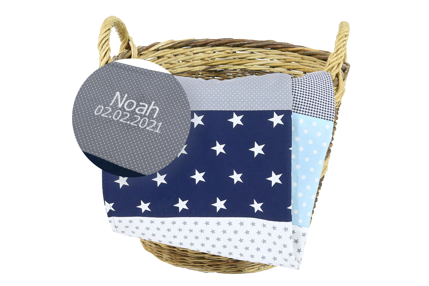 ULLENBOOM® Babydecke personalisiert 70×100 cm – Patchwork, Blau Hellblau Grau – Zertifizierte Materialien – Kinderwagendecke, Kuscheldecke, Puckdecke
