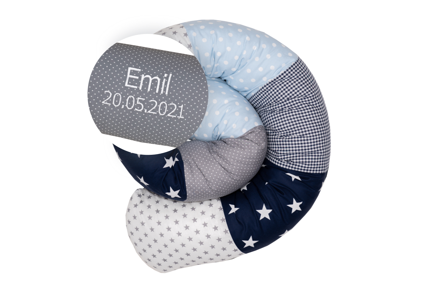 ULLENBOOM® Bettschlange mit Name und Datum personalisiert, Nestchenschlange, Blau Hellblau Grau – AuÃenstoff 100% Baumwolle – Bettrolle Babybett