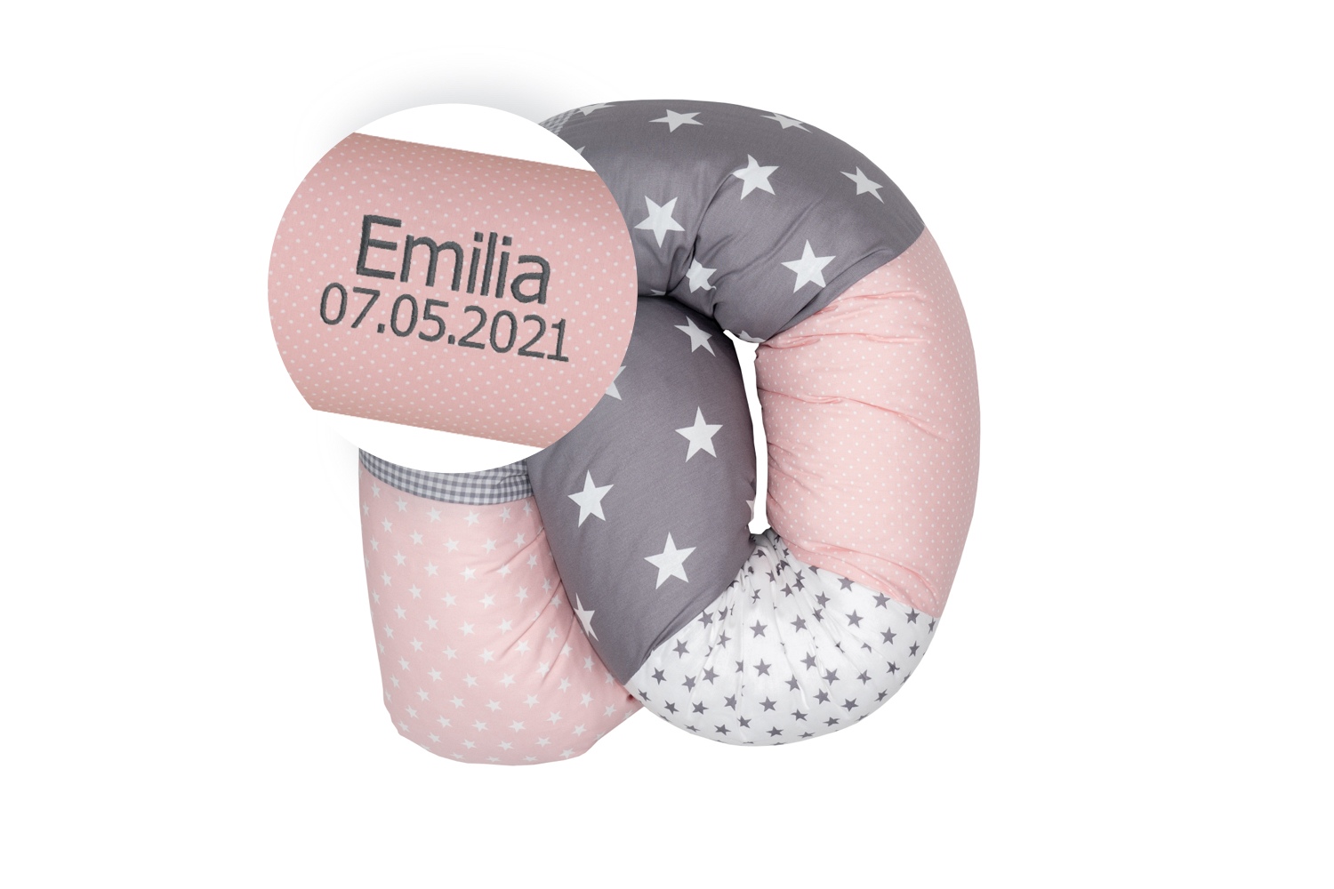 ULLENBOOM® Bettschlange mit Name und Datum personalisiert, Nestchenschlange, Rosa Grau – Außenstoff 100% Baumwolle, Weiche Füllung – Bettrolle Babybett