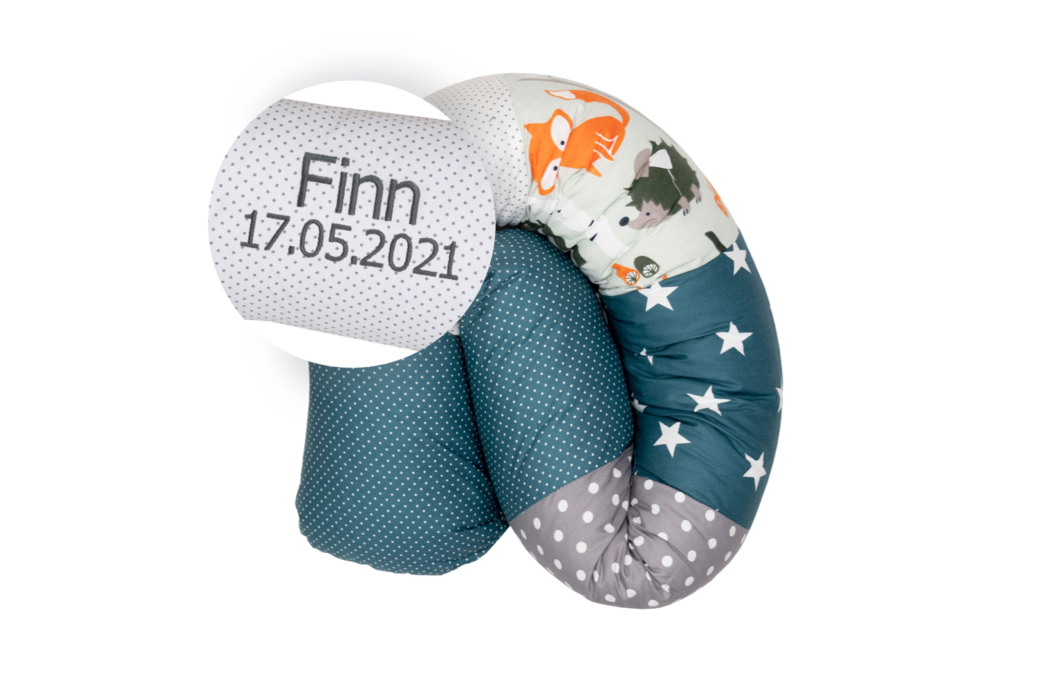 ULLENBOOM® Bettschlange mit Name und Datum personalisiert, Nestchenschlange, Waldtiere Petrol – Außenstoff 100% Baumwolle, Weiche Füllung, Bettrolle Babybett