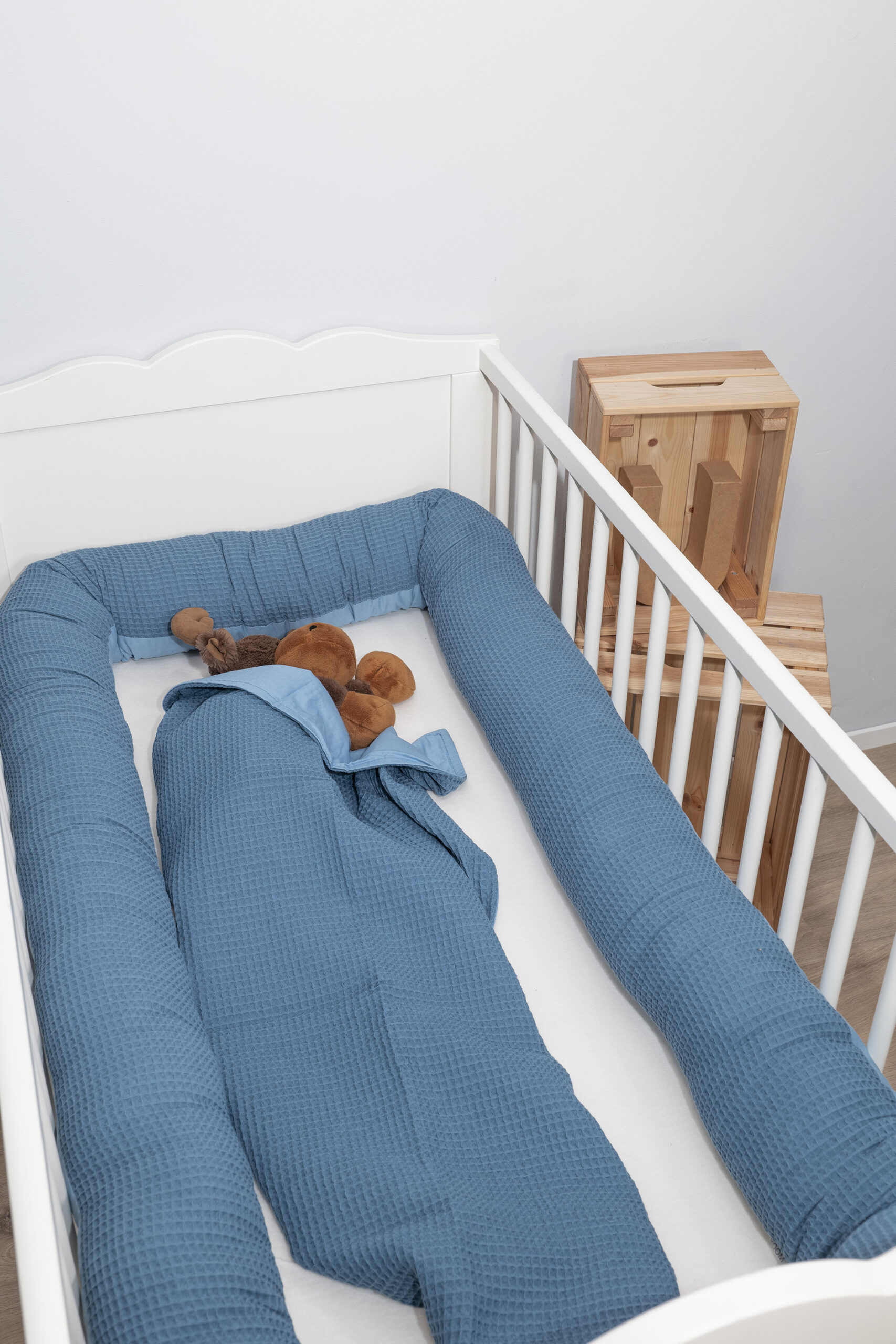 ULLENBOOM® Bettschlange, Nestchenschlange – Zwei Größen – Uni, Blau – Außenstoff 100% Baumwolle, Weiche Füllung – Bettrolle Babybett