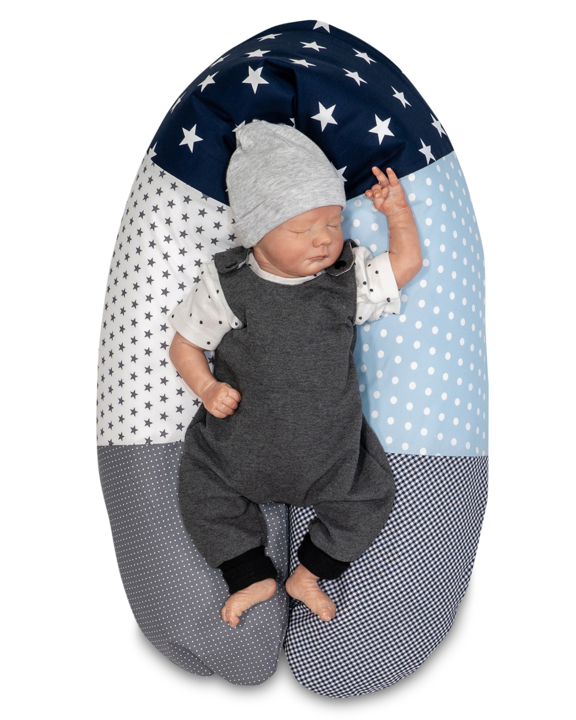 ULLENBOOM® Stillkissen 170×34 cm, Bezug + Inlett – Patchwork-Muster, Anker Blau – Füllung: Faserbällchen – Seitenschläferkissen, Ãko & Fair