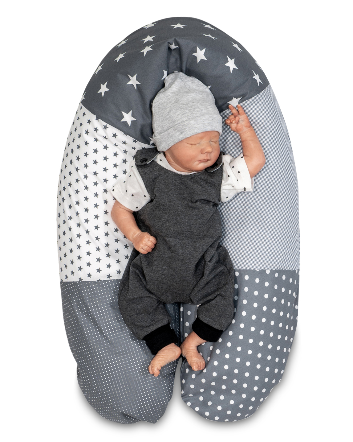 ULLENBOOM® Stillkissenbezug 170×34 cm – Patchwork-Muster, Graue Sterne – Bezug für Stillkissen, Seitenschläferkissen – Stillkissenhülle